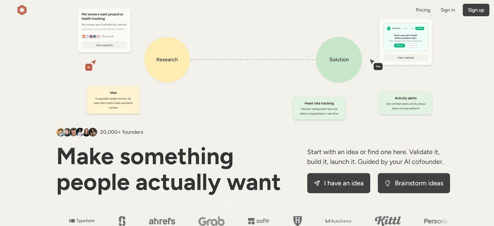 AI Cofounder provides startup idea generation tools that help users explore business concepts based on interests, skills, or market problems. The platform encourages structured thinking rather than random brainstorming.