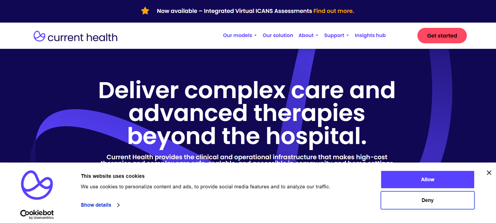 For hospital-at-home programs, Current Health also supports logistical coordination, including in-home nursing, medication delivery, and therapy services, providing a full substitute for in-hospital care.