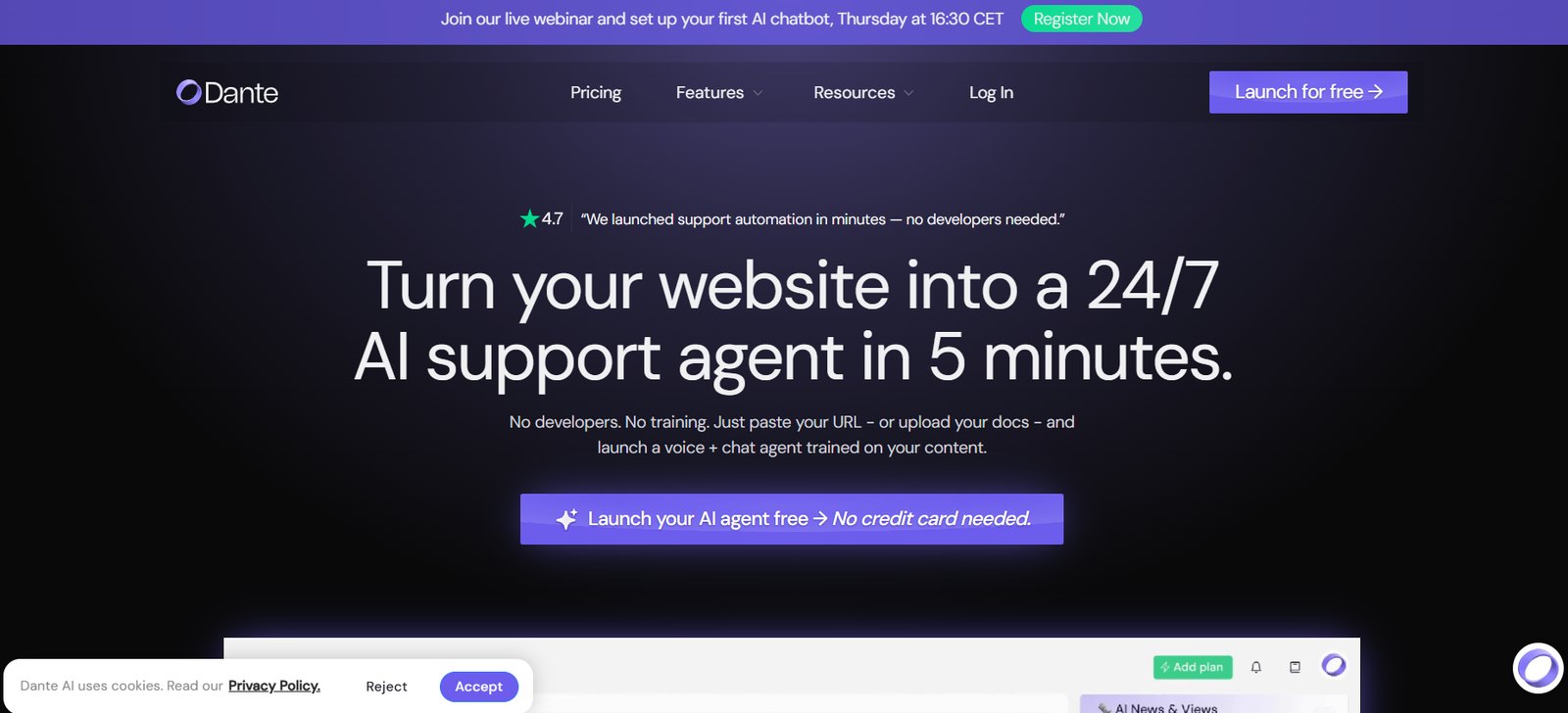 Dante AI allows users to create powerful chatbots without writing a single line of code. The intuitive dashboard guides users through setup, customization, and deployment.