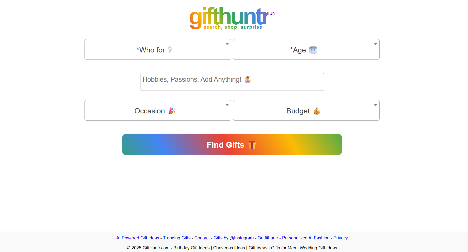 GiftHuntr is an AI-powered gift recommendation platform designed to help users discover the perfect gift for any person or occasion. By analyzing recipient traits, preferences, and context, GiftHuntr generates curated gift ideas from a wide range of online sources—ensuring that you never run out of thoughtful, relevant options.