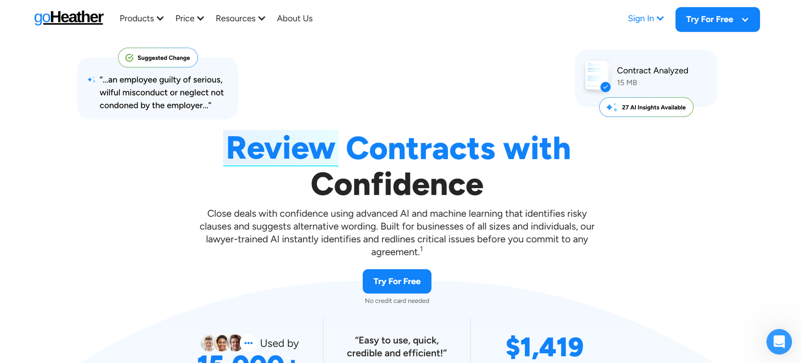 GoHeather reviews employment contracts and highlights potential legal issues, missing clauses, or unfair terms. Users can upload a document and receive an annotated version with AI feedback.