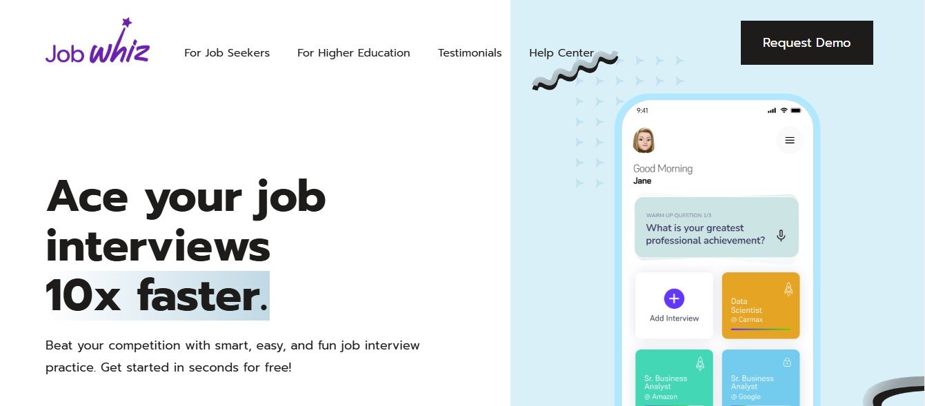 JobWhiz is an AI-powered interview preparation platform that helps job seekers practice smarter with personalized mock interviews, real-time feedback, and tailored coaching tips. Its mobile-friendly design and engaging features make it a top choice for candidates looking to boost their confidence and succeed in competitive interviews.