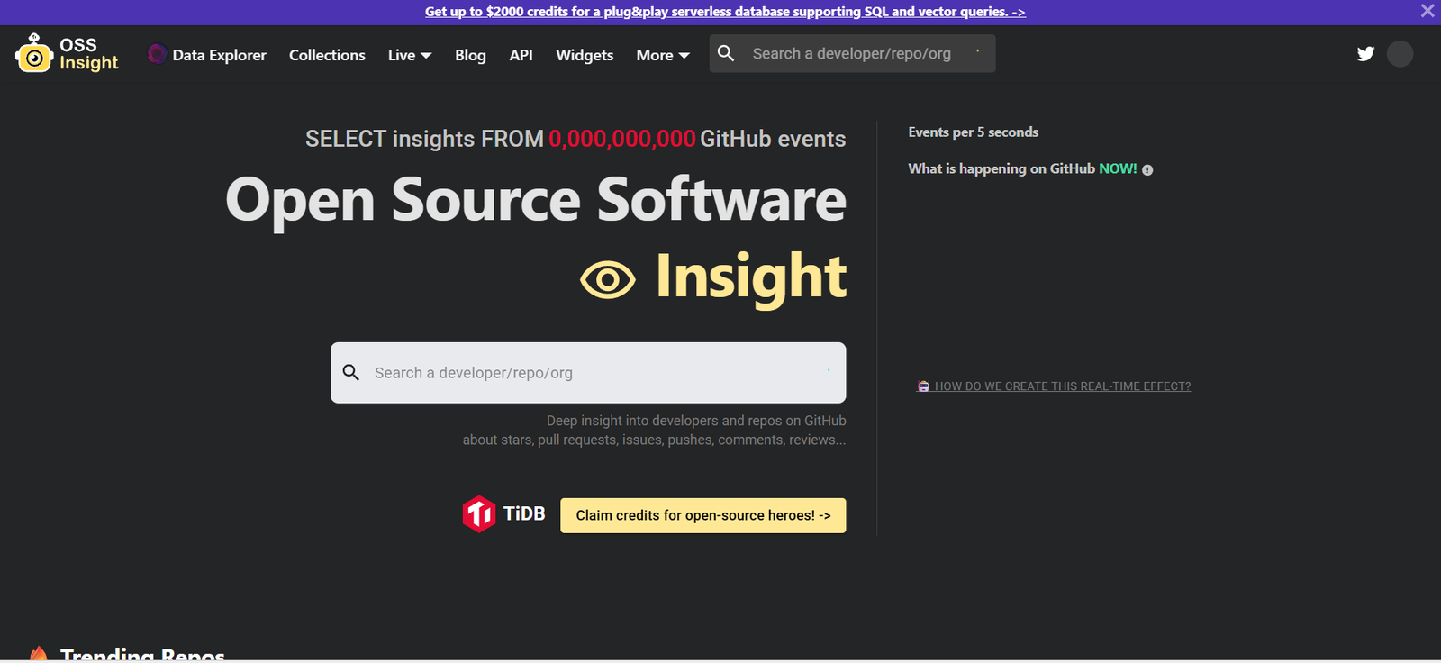 OSS Insight continuously ingests real-time GitHub data, ensuring users have access to up-to-date metrics and trends across the open-source ecosystem.