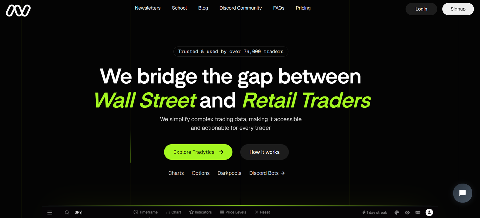 Tradytics is an AI-powered platform that simplifies complex trading data for retail traders, providing actionable insights to bridge the gap between Wall Street and individual traders.