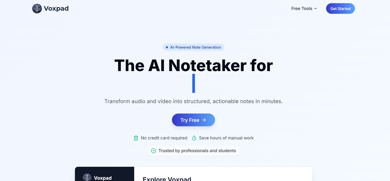 Notion lacks native voice-to-text. Voxpad provides a complete audio-first solution with search and summarization.